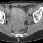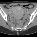 تقرر إجراء فحص طبقي محوري للمريضة مع حقن مادة ظليلة والذي بين بكل وضوح أن هذه البنية ماهي إلا الحالب الأيمن الذي يبدي سماكة جدارية نسبية وهو مرئي على كامل طوله، الصورة الصدوية في الحفرة الحرقفية اليمنى تترجم مسار متعرّج لهذا الحالب والذي يفسّر أيضاً منشأ الالتهاب (ركودة مثلاً)..